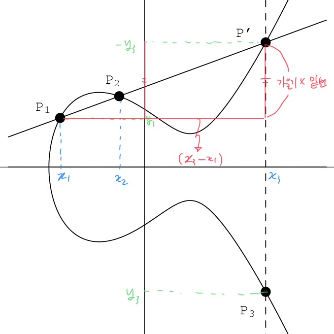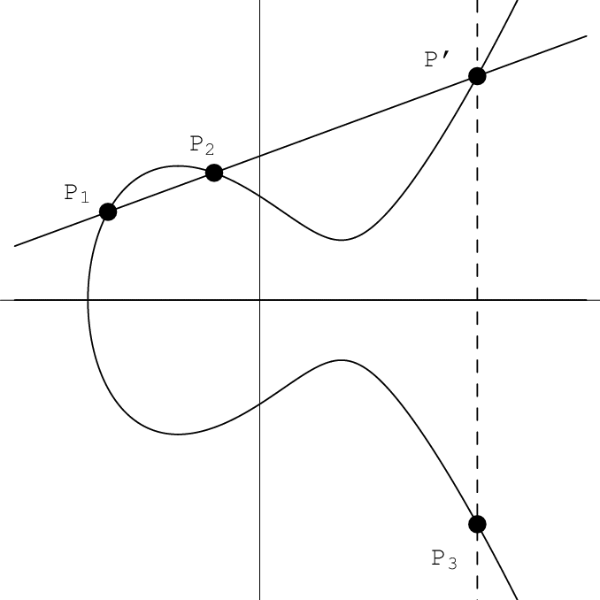 우선 $P_1$과 $P_2$를 지나는 직선과 타원 곡선이 만나는 점($P'$)을 구한다. 이를 $x$축 대칭 시킨 결과가 $P_3$가 된다.