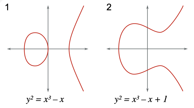 이때 $a$와 $b$에 따라 타원 곡선의 모양이 달라진다. 예를 들어 아래 1번 곡선은 $a=-1, b=0$일 때의 타원 곡선이고, 2번 곡선은 $a=-1, b=1$일 때의 타원 곡선이다.